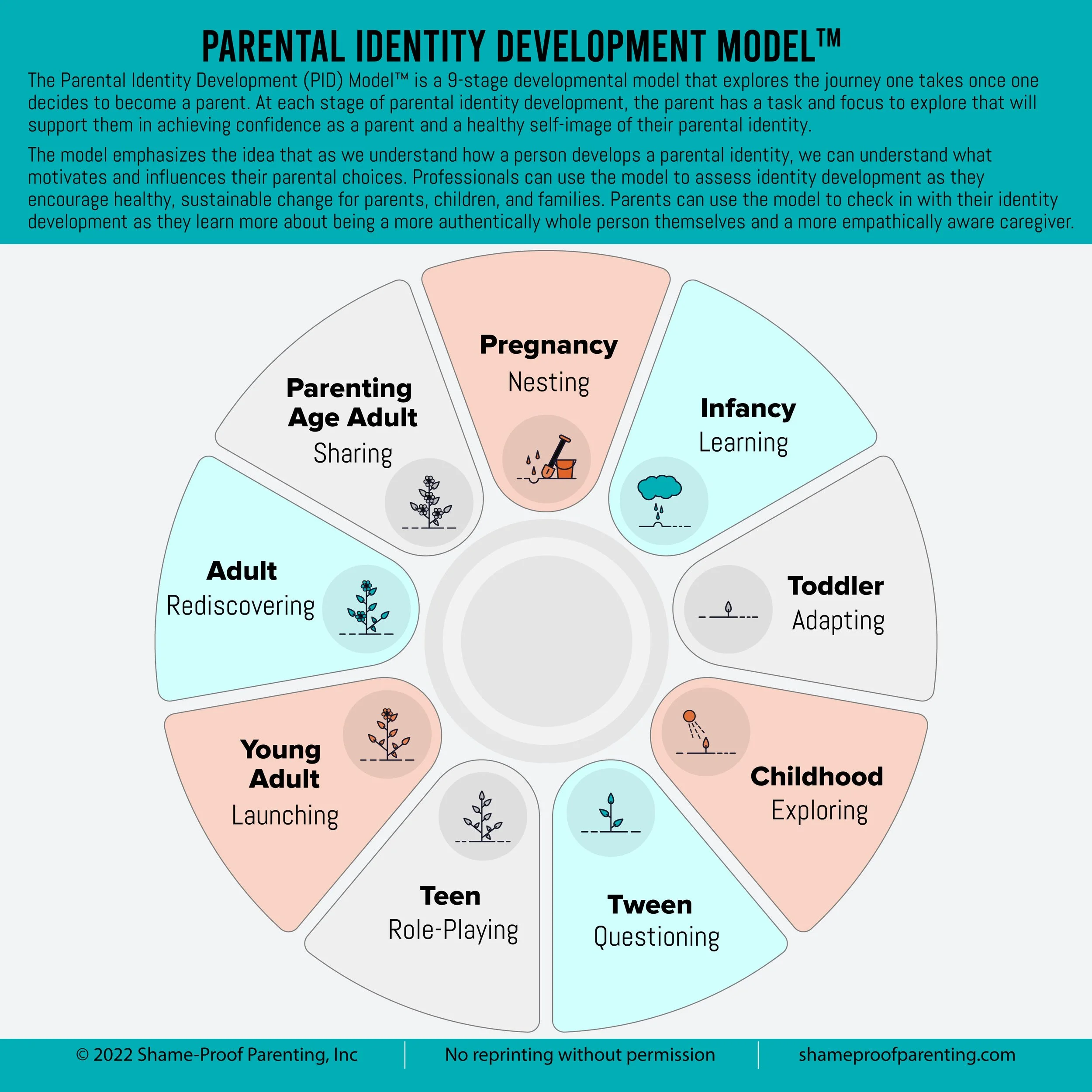 The Parental Identity Development (PID) Model (TM) is a 9-stage developmental model where at each stage of development the parent must complete a task in order for them to achieve competency, confidence, and a healthy self-image of their parenting identity.